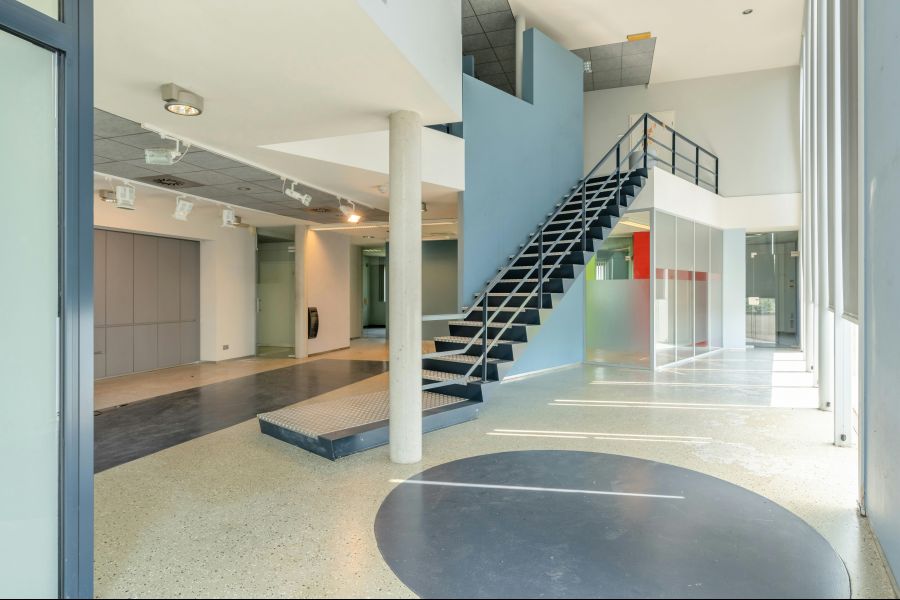 De kantoorruimtes vanaf 450 m² zijn verdeeld over het gelijkvloers en een verdieping, en vragen om een renovatie/opfrissing. De indeling is functioneel met een onthaal, keuken, sanitair en vier burelen op het gelijkvloers, en op de verdieping een vergaderruimte en drie burelen.